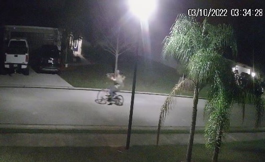 Security video captured a lone individual riding a bicycle down the street at 3:30 AM.